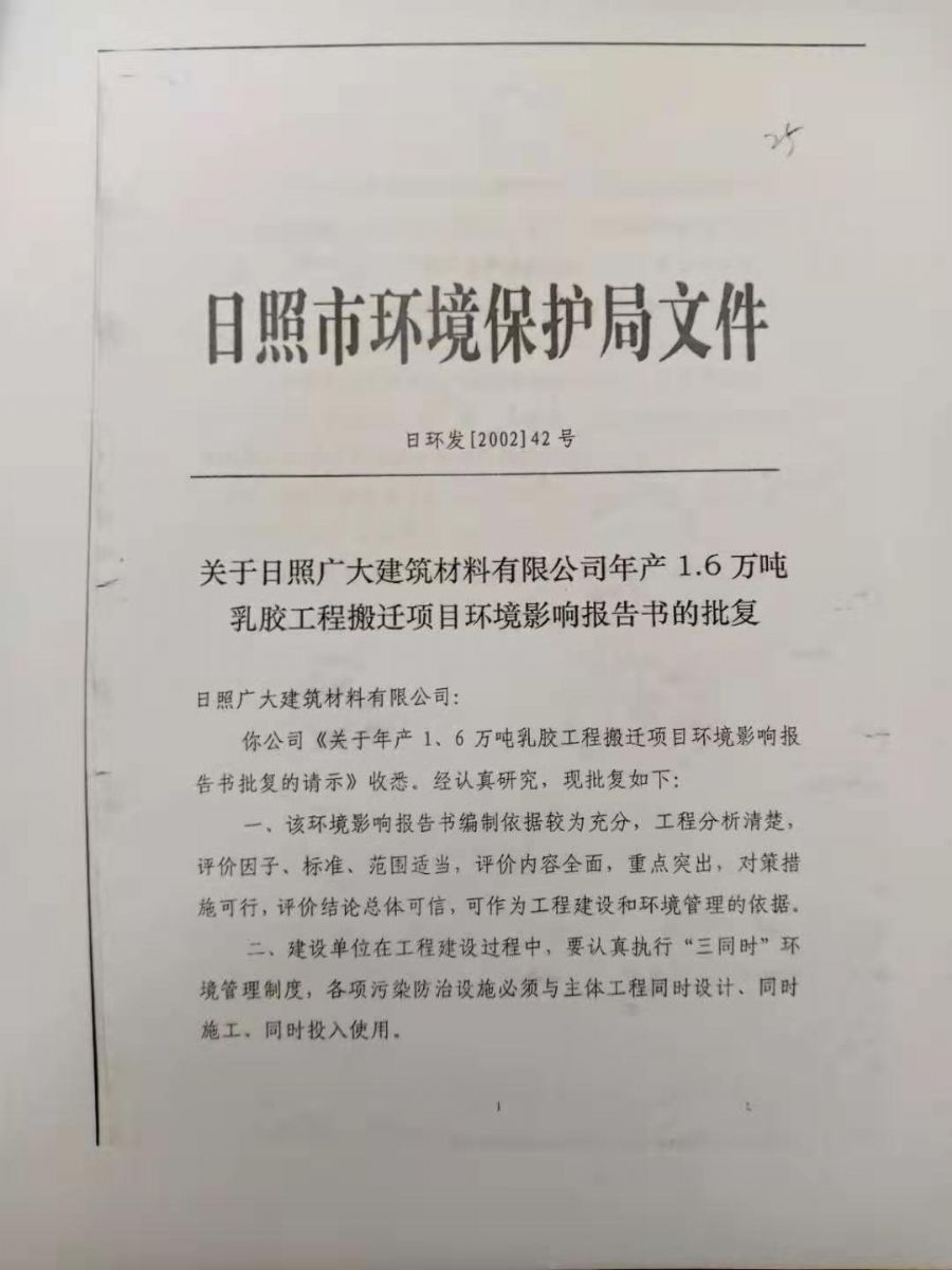 日照廣大建筑材料有限公司,位于風景秀麗的海濱城市山東日照,成立于1988年,是專業(yè)生產高分子化工產品,集科研開發(fā)、生產經營為一體的化工企業(yè),主要產品為丙烯酸脂類乳液和丁苯膠乳。是國內目前江北同行業(yè)產銷量最大企業(yè)之一。